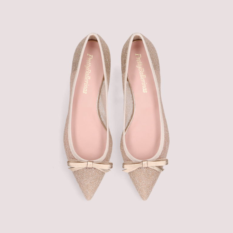 エレガントなポインテッドトゥのフォルムが特徴のプリティ・バレリーナの人気定番モデル【ELLA/エラ】。清涼感あふれるクラックレースに、微細なグリッターが輝くシアーな一足です。メタリックレザーのリボンが上品なアクセントとなり、足元をフェミニンかつ華やかに演出。素肌がのぞくシアーな抜け感で、いつものコーディネートをより優雅で軽やかな印象に