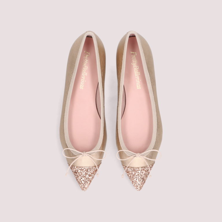 エレガントなポインテッドトゥのフォルムが特徴のプリティ・バレリーナの人気定番モデル【ELLA/エラ】。アッパーに光沢が美しい羊革のメタリックレザー、トゥキャップにグリッター素材をコンビネーション。エレガントなスタイルにもデイリーにも幅広く活躍する華やかな一足です。