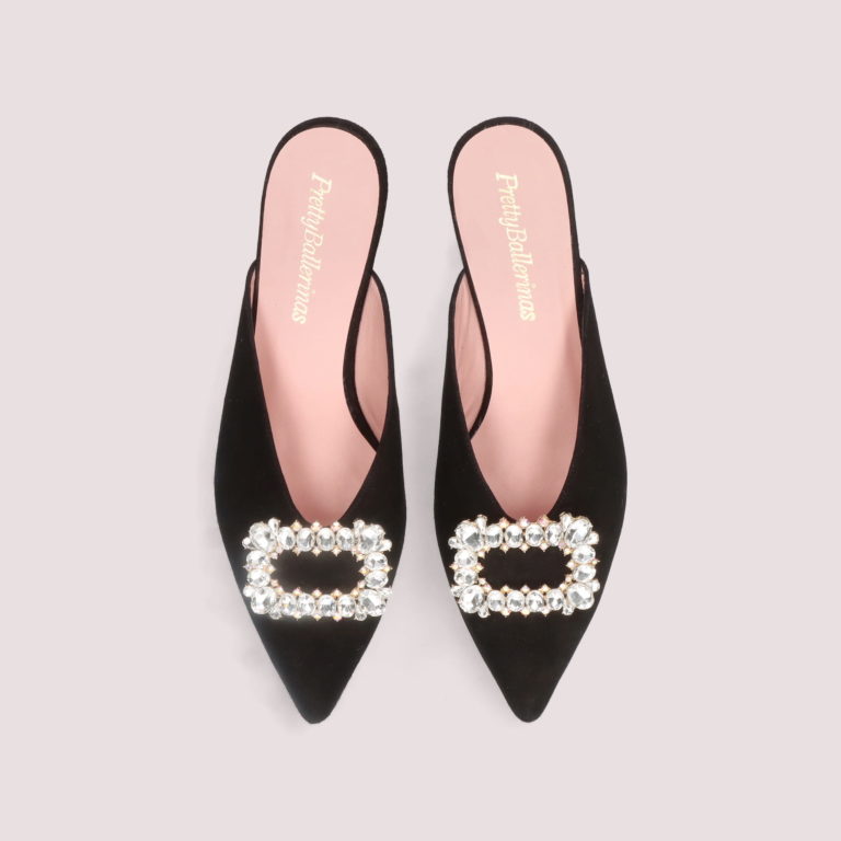 エレガントなポインテッドトゥに1.5cmのヒールが特徴的なプリティ・バレリーナの人気定番モデル【CLEMENTINE/クレメンタイン】。柔らかな山羊革スエードアッパーに大粒ビジューをあしらったスクエアバックルが華やかに輝き、足元にリュクスな存在感を添えます。すっと履けるミュールデザインが軽やかな抜け感を演出し、ドレスアップからデイリーまで幅広く活躍する一足です。